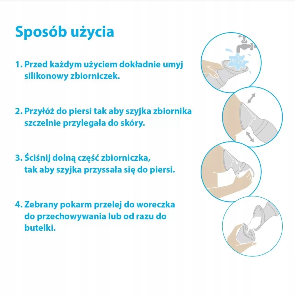 Prezentowany odciągacz mleka wykonany jest z miękkiego, bezpiecznego silikonu. Jego kształt przypomina lejek połączony z małym zbiorniczkiem. Przed użyciem należy ścisnąć laktator, a następnie przyłożyć do piersi, tak aby górna część szczelnie otoczyła sutek. Puszczając laktator, wytwarzasz podciśnienie, które delikatnie zasysa pierś, imitując delikatnie ssanie dziecka. W ten sposób żadna kropla cennego pokarmu się nie zmarnuje. Laktator – kolektor jest na tyle lekki, że nie musisz go podtrzymywać ręką. Masz dzięki temu pełną swobodę, aby dobrze przystawić dziecko do drugiej piersi. Po skończonym karmieniu, mleko z laktatora możesz zamknąć w nim za pomocą szczelnej przykrywki i odstawić do lodówki bądź przelać do woreczka i zamrozić.