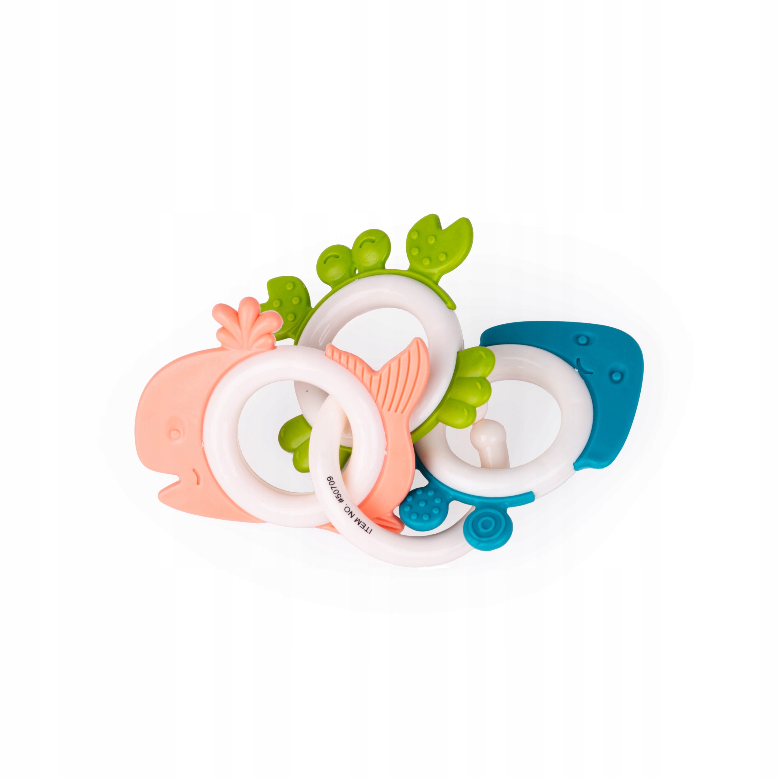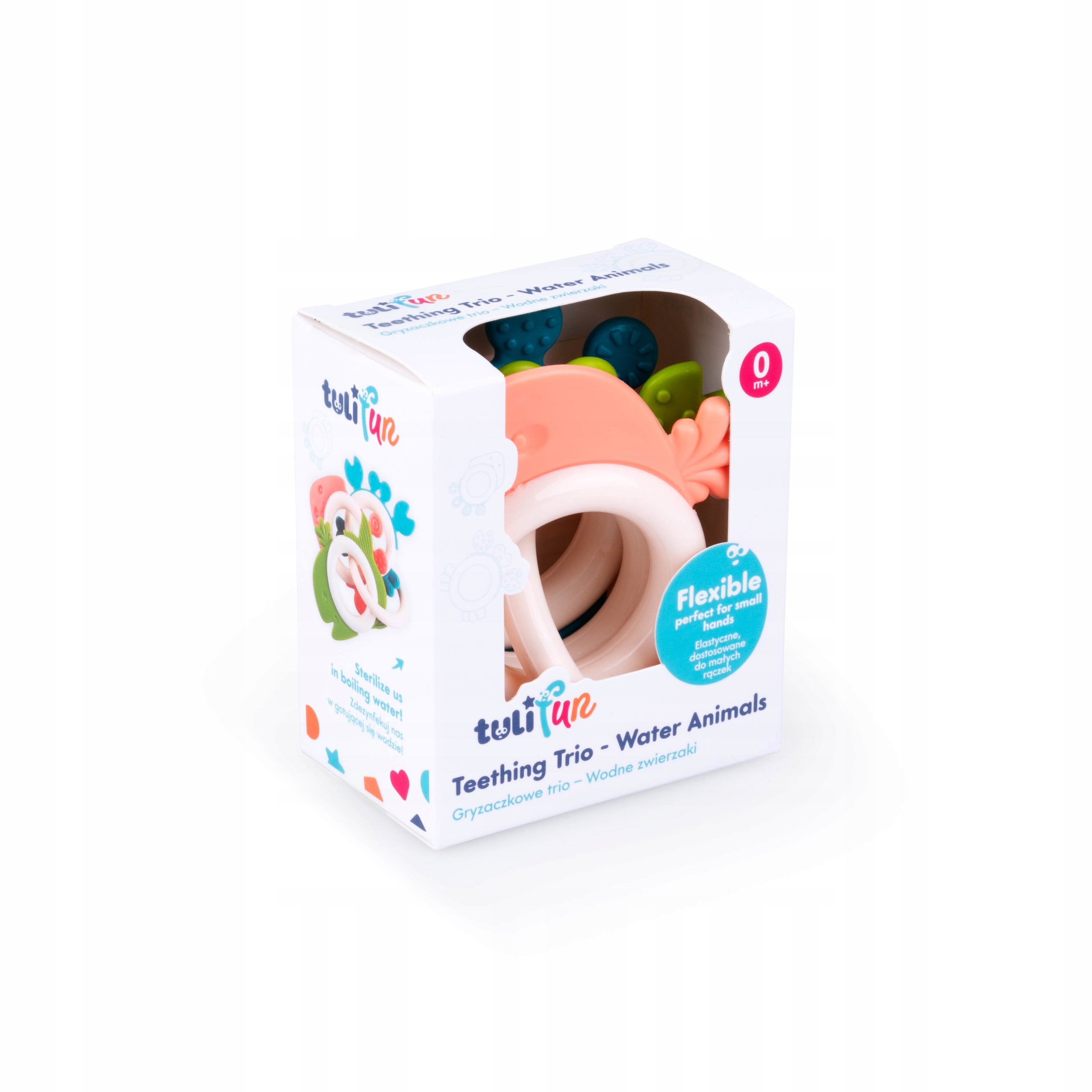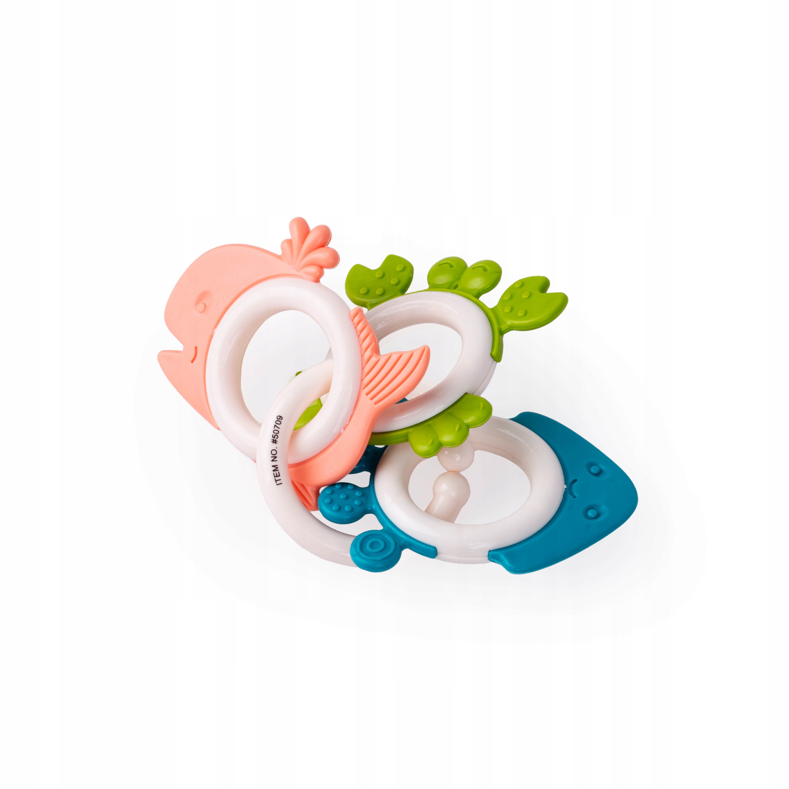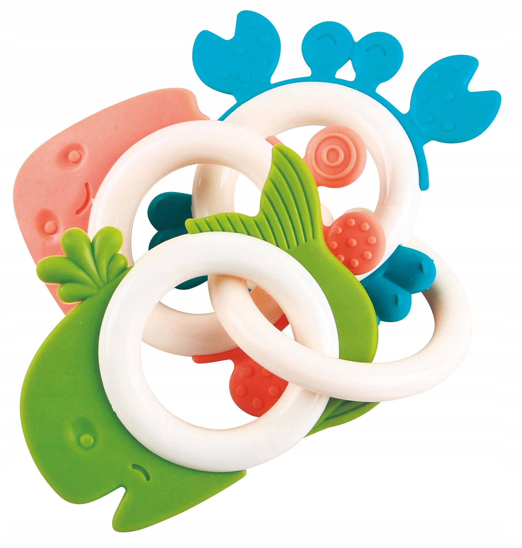 Trzy gryzaczki spięte są wspólnym kółeczkiem, które stanowi zarazem praktyczny uchwyt. Każdy z nich odznacza się innym kształtem oraz kolorem. Gryzaczki posiadają wypustki, które podczas gryzienia delikatnie masują obolałe dziąsła ząbkującego maluszka.