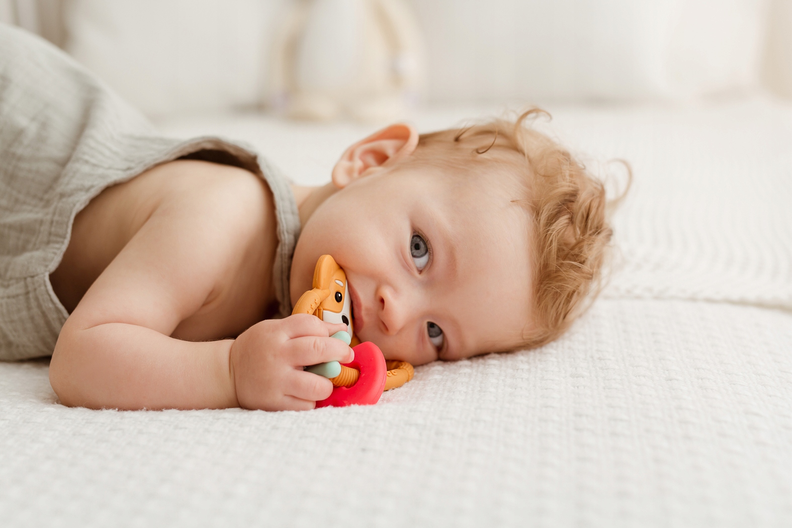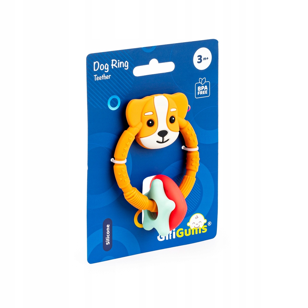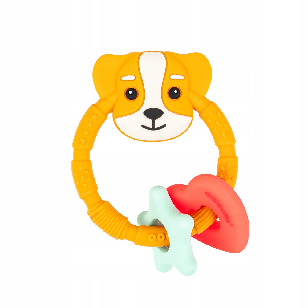 Gryzaczek w kształcie obręczy z pieskiem stanie się nieodłącznym towarzyszem ząbkującego maluszka. Na obręczy znajdują się zróżnicowane wypustki, a poza psią główką, gryzak zdobią jeszcze dwa ruchome elementy – serduszko i gwiazdka. Podobnie jak obręcz z pieskiem, są one mięciutkie i także mogą służyć za gryzak. Uroczy wygląd zabawki z pewnością przypadnie do gustu bobasowi, czyniąc ją nie tylko praktyczną pomocą w ząbkowaniu, ale też stylowym dodatkiem, z którego korzystać można zarówno w domu, jak i na wycieczce.