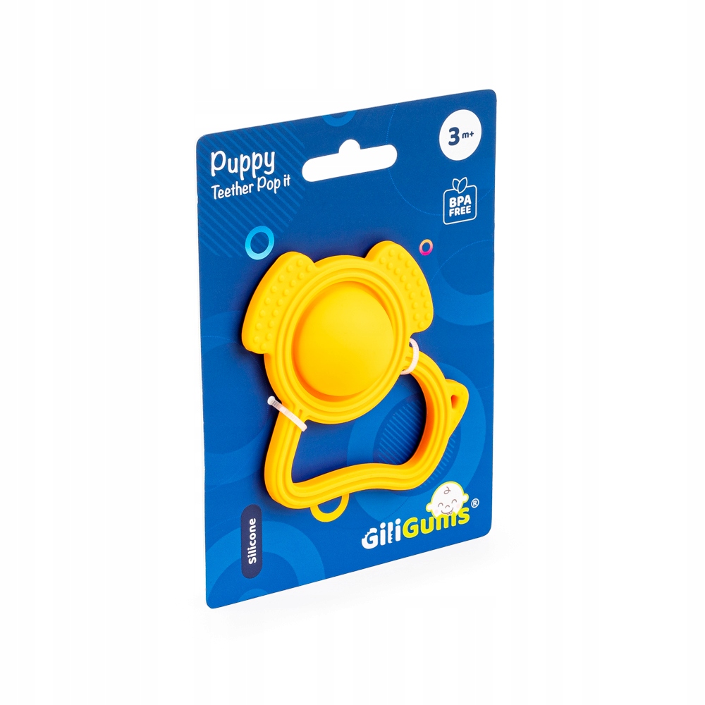 Ten wesoły piesek poza rolę gryzaka pełni też funkcję zabawki. W główce psiaka kryje się kulka, którą należy wcisnąć, aby przeszła na drugą stronę psiej głowy, a następnie czynność powtórzyć, przeciskając kuleczkę z powrotem do góry. Ta odprężająca zabawa, nie tylko zapewni rozrywkę, ale także pomoże ćwiczyć sprawność paluszków.