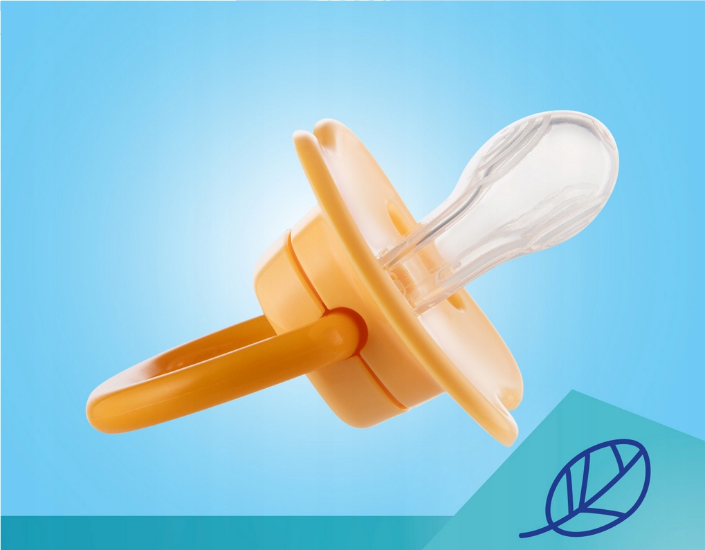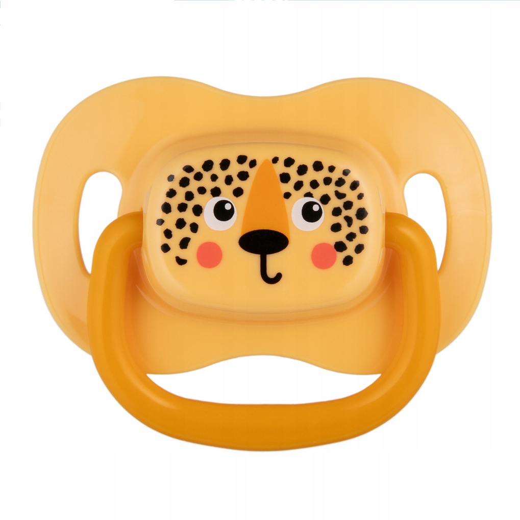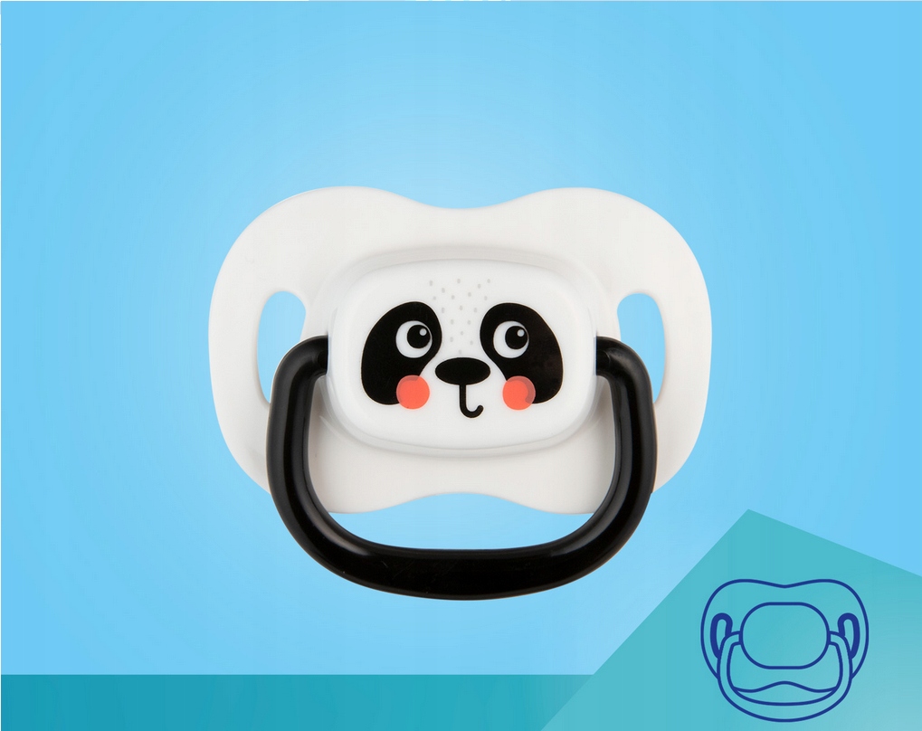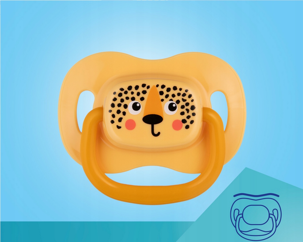Gumka o symetrycznym kształcie została wykonana z najwyższej jakości, bezpiecznego i delikatnego silikonu. Jest bezzapachowa i bezsmakowa, co ułatwia akceptację smoczka przez dziecko. Otwory wentylacyjne w tarcze zapewniają swobodne oddychanie i połykanie śliny. Specjalnie zaprojektowany kształt tarczki, minimalizuje odciskanie się smoczka na delikatnej buzi dziecka, zapobiegając podrażnieniom.