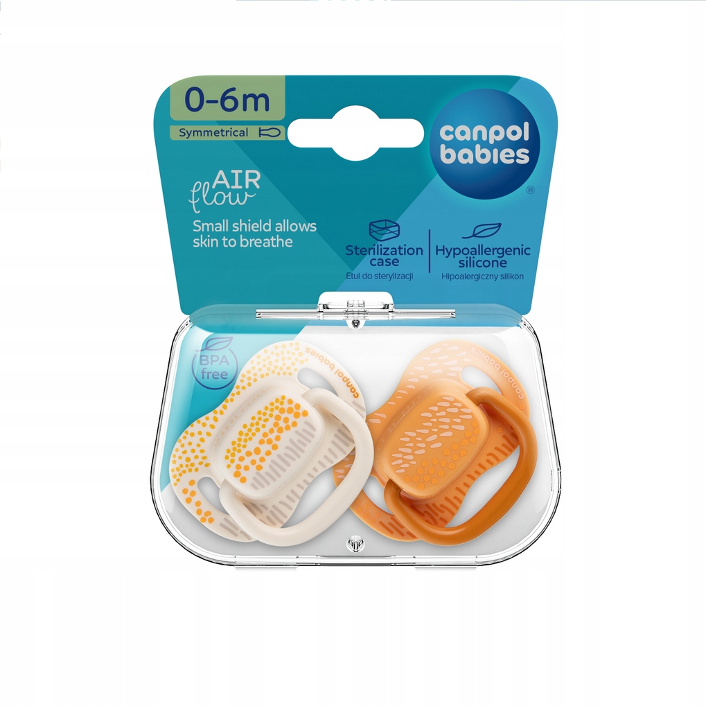 Smoczek symetryczny Canpol babies jest trwały i odporny na odkształcenia. W produkcji nie stosowano BPA ani innych szkodliwych substancji. Smoczek symetryczny dobrze dopasowuje się do buzi dziecka niezależnie od sposobu umieszczenia, a jego kształt uważany jest za najbardziej fizjologiczny i wspierający utrzymanie naturalnego rytmu ssania oraz prawidłowego rozwoju mowy. Smoczek rekomendowany dla dzieci w wieku 0-6 miesięcy.