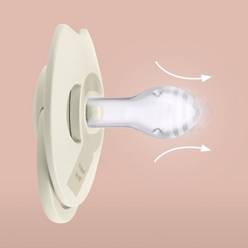 Dynamiczny smoczek, dzięki unikalnej budowie z silikonu o różnej grubości, rozciąga się i kurczy zgodnie z rytmem ssania dziecka. Dzięki temu chroni jego odruch ssania i nie ma niekorzystnego wpływu na karmienie piersią. Kształt gumki jest symetryczny i inspirowany kształtem brodawki sutkowej, by zapewnić dziecku znajome odczucia. Tarczka smoczka ma specjalne wycięcie, by ułatwić oddychanie noskiem i przełykanie śliny podobnie jak przy piersi. Wyprofilowana tarczka jak najmniej przylega do skóry dziecka, co ułatwia swobodny przepływ powietrza i zmniejsza ryzyko podrażnień skóry.