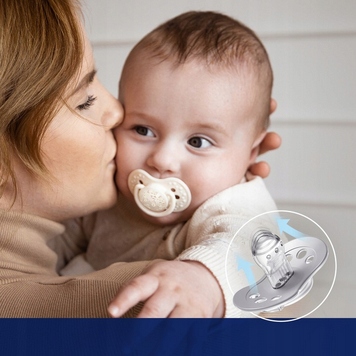 Dynamiczny smoczek, dzięki unikalnej budowie z silikonu o różnej grubości, rozciąga się i kurczy zgodnie z rytmem ssania dziecka. Dzięki temu chroni jego odruch ssania i nie ma niekorzystnego wpływu na karmienie piersią. Gumka ma symetryczny kształt inspirowany kształtem brodawki sutkowej wypełnionej mlekiem, co zapewnia dziecku znajome odczucia podobne jak przy piersi.