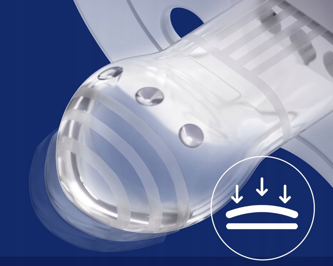 – spłaszczona gumka i cienka szyjka smoczka, umożliwiają dziecku swobodne domknięcie i odpowiednią pracę dziąseł podczas ssania.