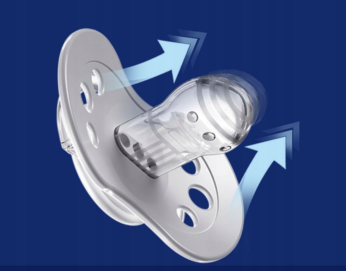 Gumka smoczka jest spłaszczona, a szyjka jest tak cienka, by umożliwić dziecku swobodne domykanie i odpowiednią pracę dziąseł podczas ssania oraz zapewnić wystarczającą ilość miejsca w buzi na pracę języka, co zmniejsza ryzyko wad zgryzu i wymowy*. W smoczkach 18m+ silikonowa gumka smoczka jest wzmocniona, dzięki temu odporniejsza na gryzienie. Jest to ważne szczególnie w okresie intensywnego rozwoju ząbków i dziąseł.​