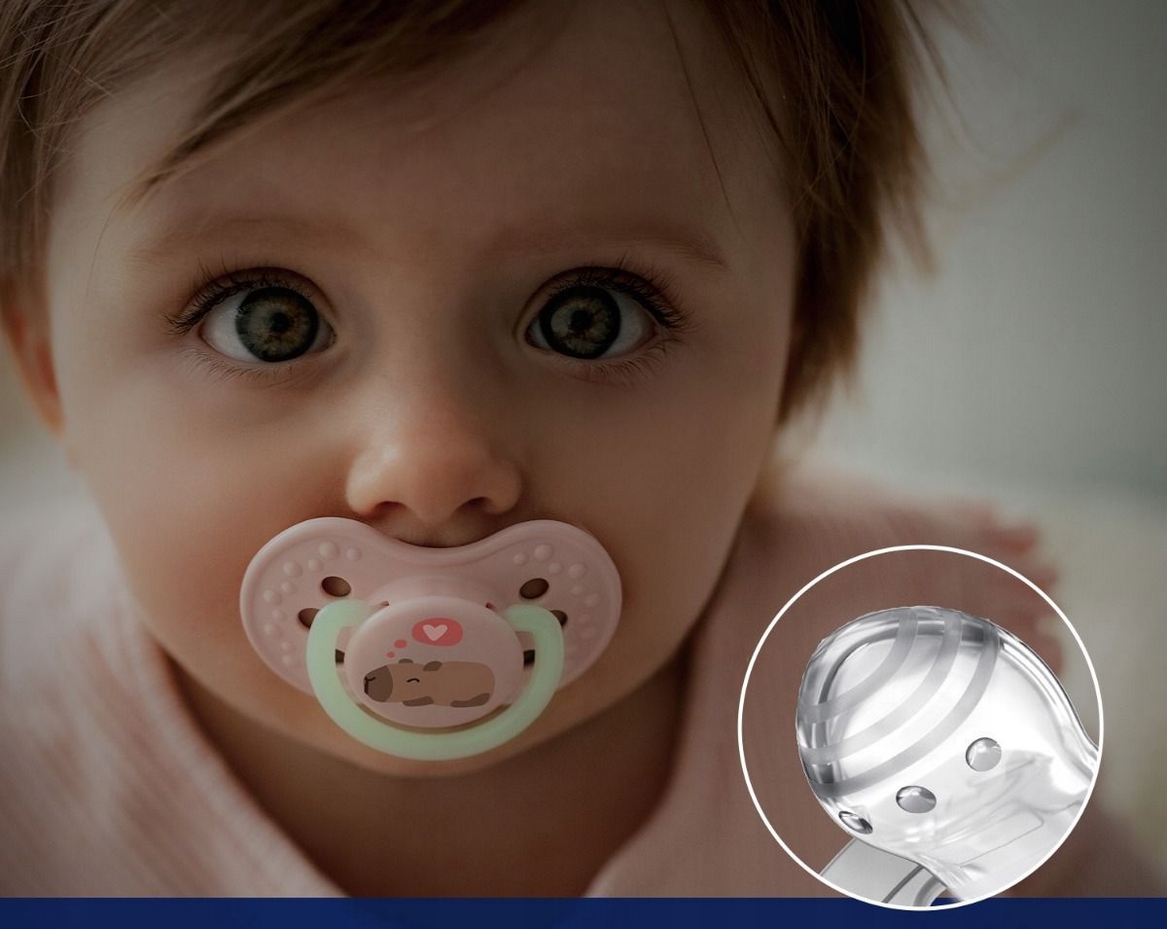 Jeden ze smoczków w zestawie posiada uchwyt, a drugi kapsel świecący w ciemności, co ułatwia znalezienie smoczka w nocy.​