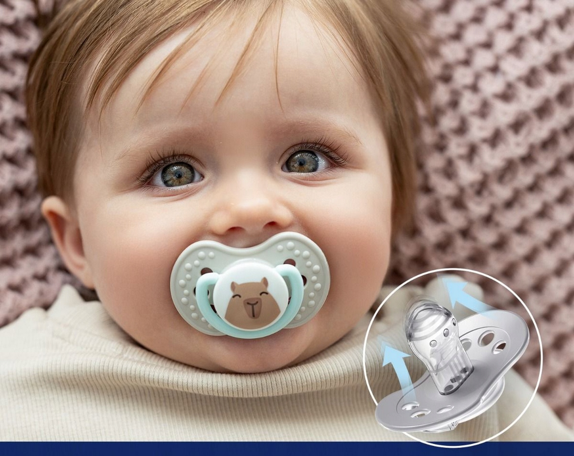 Dynamiczny smoczek, dzięki unikalnej budowie z silikonu o różnej grubości, rozciąga się i kurczy zgodnie z rytmem ssania dziecka. Dzięki temu chroni jego odruch ssania i nie ma niekorzystnego wpływu na karmienie piersią. Gumka ma symetryczny kształt inspirowany kształtem brodawki sutkowej wypełnionej mlekiem, co zapewnia dziecku znajome odczucia podobne jak przy piersi. ​