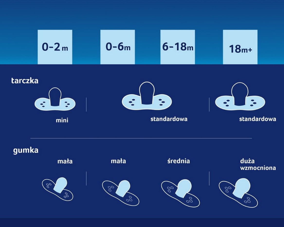 • rozmiary gumki i tarczki smoczka zostały dopasowane do wieku i etapu rozwoju dziecka.