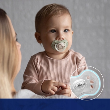 - rozmiary gumki i tarczki smoczka zostały dopasowane do wieku i etapu rozwoju dziecka.