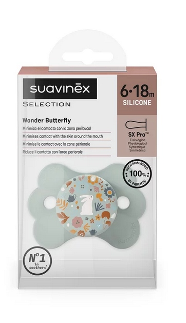 Smoczek WONDERLAND z wypukłą tarczką w kształcie motylka i fizjologicznym smoczkiem SX Pro – polecanym przez pediatrów i stomatologów dziecięcych.