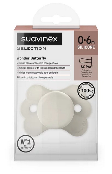 Smoczek WONDERLAND z wypukłą tarczką w kształcie motylka i fizjologicznym smoczkiem SX Pro – polecanym przez pediatrów i stomatologów dziecięcych.