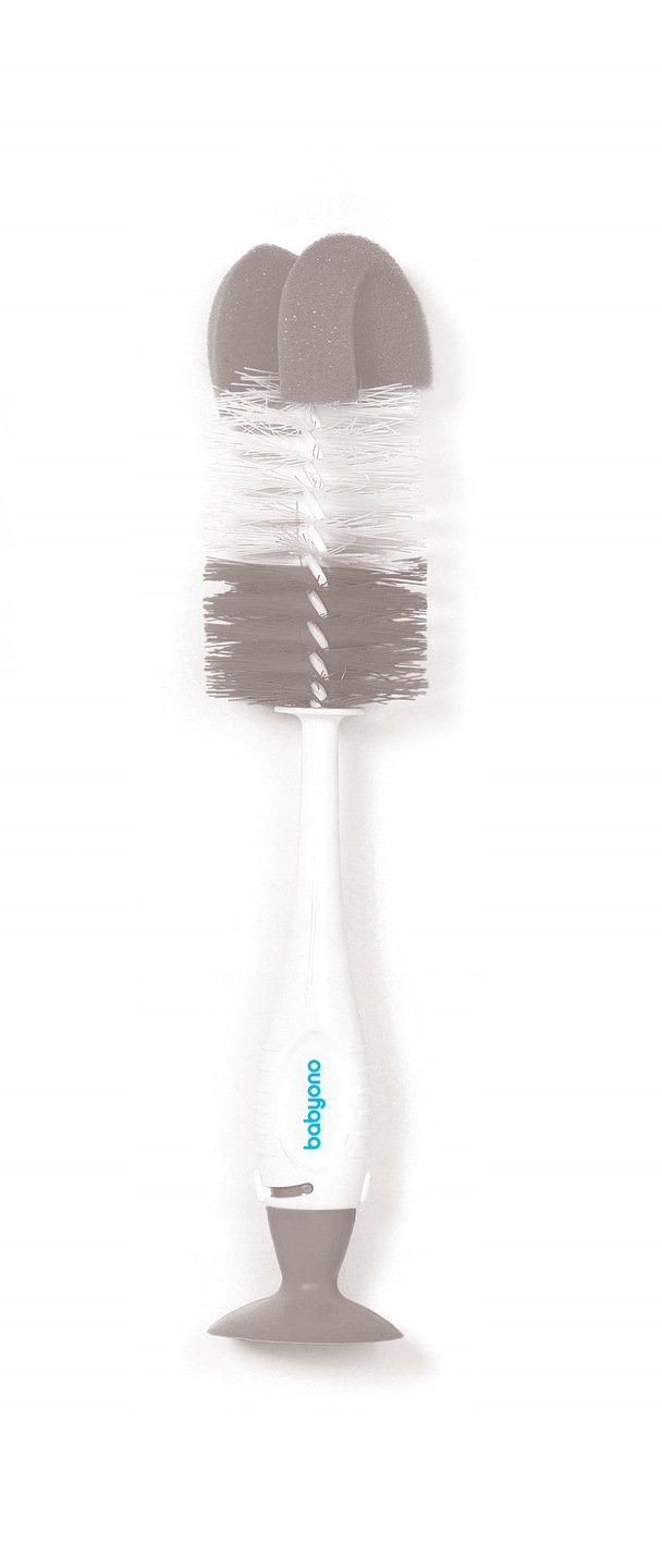 Szczotka z przyssawką „SAMOSTOJĄCA” pomaga w dokładnym czyszczeniu zarówno butelki, jak i smoczka. Szczotka posiada przyssawkę, która umożliwia przyczepienie jej do płaskich powierzchni, dla ułatwienia osychania. Szczotka do butelki jest zakończona miękką gąbką, która dostosowuje się do kształtu butelki. W uchwycie rączki jest schowana mała szczotka do czyszczenia smoczka. Miękkie włosie szczotek i gąbka docierają do trudno dostępnych miejsc. Szczotki wykonane są z trwałych i bezpiecznych materiałów, nie zawierających Bisfenolu A.