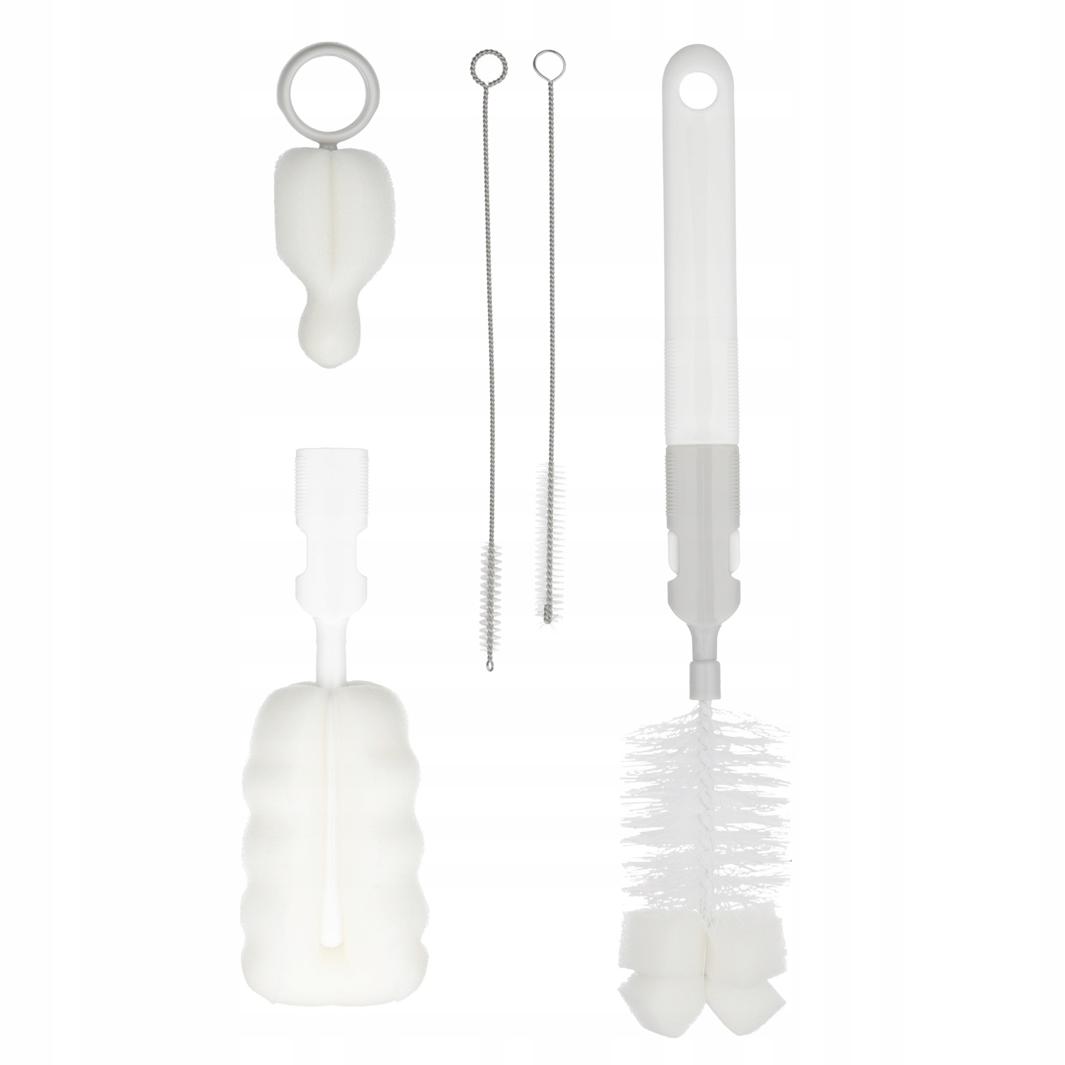 Praktyczny zestaw szczotek ułatwi codzienne mycie butelek i smoczków. Mała szczoteczka z gąbki przeznaczona jest do delikatnego czyszczenia smoczków z zabrudzeń po mleku lub kaszce. Dzięki wymiennej rączce, w zależności od potrzeb, możesz użyć końcówki z włosiem lub z samą gąbką. Dwie większe szczotki przeznaczone są do mycia butelek. Dodatkowe mini szczoteczki służą do dokładnego mycia rurek kubeczków i bidonów. Włosie szczotek wykonane jest z tworzywa, które nie rysuje powierzchni. Gąbka umożliwia dokładniejsze mycie dna butelek.