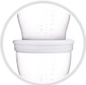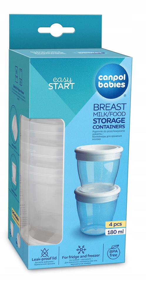 Praktyczne pojemniki umożliwiają długotrwałe przechowywanie pokarmu utrzymując jego wysoką jakość. Posiadają szczelne pokrywki, dzięki czemu nic się z nich nie wylewa nawet gdy pojemnik jest przechylony. Można je ustawić jeden na drugim. Posiadają czytelną skalę. Pokrywka może także pełnić funkcję podstawki – dla lepszej stabilizacji przy przelewaniu płynu. Wykonane zostały z materiału przeznaczonego do kontaktu z żywnością. W opakowaniu 4 pojemniki z pokrywkami o pojemności 180ml.
