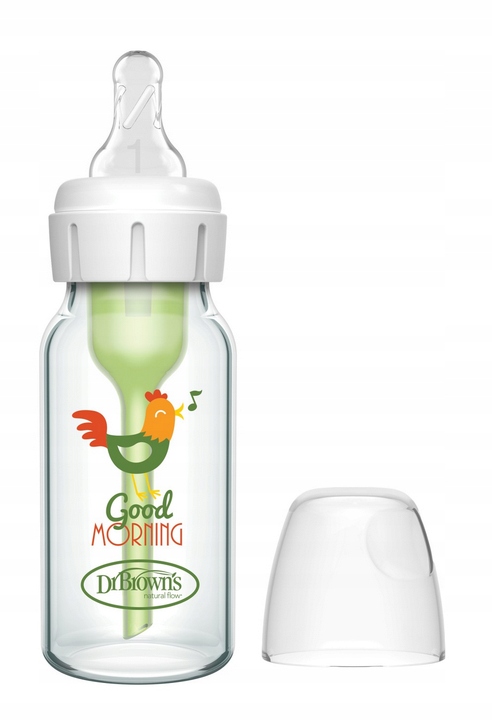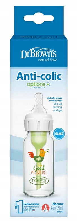 Butelka antykolkowa Dr Brown’s Options+ szklana jest przeznaczona do karmienia maluszka od pierwszych dni życia. Wyposażona w smoczek o najwolniejszym przepływie (poziom 1). Pojemność 120ml.