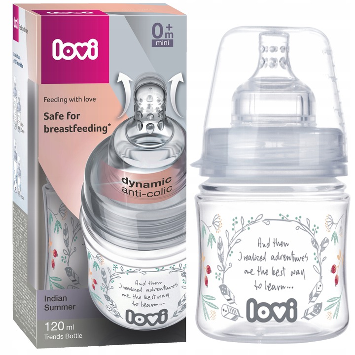 Butelka do karmienia marki Lovi została ozdobiona pięknymi nowoczesnymi wzorami, które czynią ją wyjątkową i jedyną w sowim rodzaju. Wyposażona została w dynamiczny smoczek, który zapewnia bezpieczne karmienie malucha. Specjalny system antykolkowy zmniejsza ryzyko wystąpienia bolesnej kolki u dziecka. Butelka została przebadana medycznie.