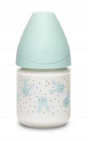 Wysokiej jakości szklane butelki dla niemowląt z okrągłym, silikonowym, smoczkiem o wolnym przepływie, o pojemności 120 ml.