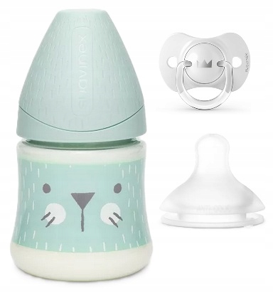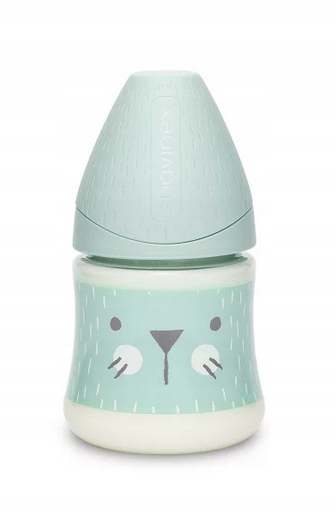 Wysokiej jakości poliamidowe butelki dla niemowląt z okrągłym, silikonowym, smoczkiem o wolnym przepływie, o pojemności 150 ml.