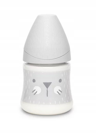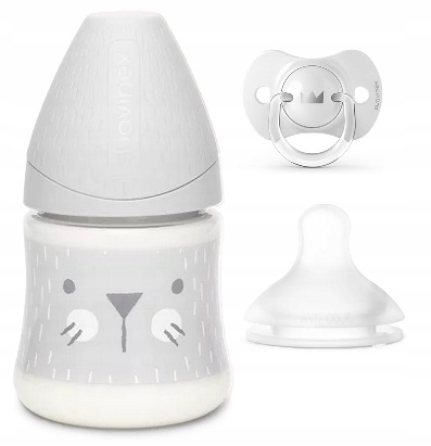 Wysokiej jakości poliamidowe butelki dla niemowląt z okrągłym, silikonowym, smoczkiem o wolnym przepływie, o pojemności 150 ml.