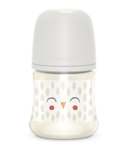 Butelka o pojemności 150 ml wyposażona jest w smoczek SX Pro o wolnym przepływie przepuszczającym niewielką ilość cieczy i przeznaczonym do karmienia mlekiem w pierwszych dniach życia i podawania wody.