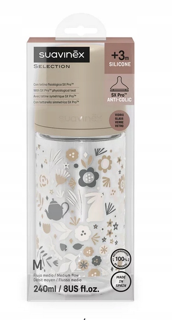 Najwyższej jakości butelka szklana z kolekcji WONDERLAND. Butelka o pojemności 240ml wyposażona jest w smoczek SX PRO zaprojektowany z myślą o rozwoju jamy ustnej dziecka. Wskazana dla niemowląt od ich 3 miesiąca życia, smoczek pozwala na utrzymywanie języka w tej samej naturalnej pozycji, jak podczas karmienia piersią. Przewagą szklanych butelek jest fakt, iż nie pochłaniają żadnych zapachów ani smaków żywności.