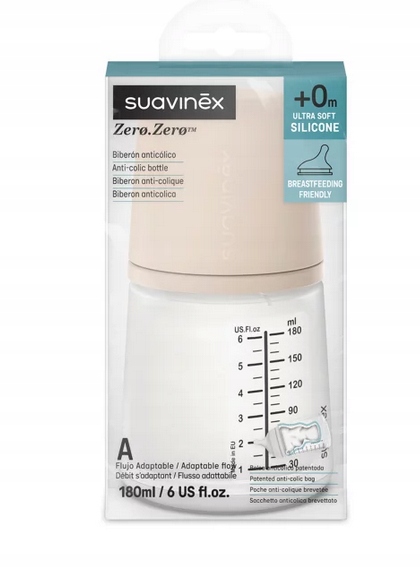 BUTELKA DO KARMIENIA ZERO ZERO 180ML SU. Smoczek SU (PRZEPŁYW ADAPTABLE) z otworem zapwniającym wielkość przepływu regulowaną poprzez siłę ssania dziecka. Smoczek zaprojektowany specjalnie w celu łączenia karmienia piersią z karmieniem butelką.