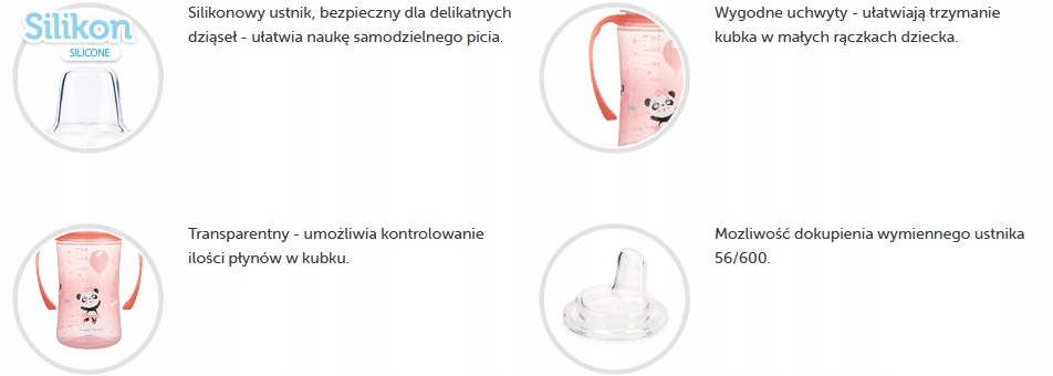 Posiada wygodne uchwyty ułatwiające dziecku trzymanie kubeczka. Szeroka szyjka kubka ułatwia mycie oraz nalewanie do niego płynów. Miękki silikonowy ustnik nie podrażnia delikatnych dziąseł dziecka. Po zdjęciu uchwytów kubek może pełnić funkcję bidonu dla starszego dziecka. Szczelna osłonka chroni ustnik przed zabrudzeniem.