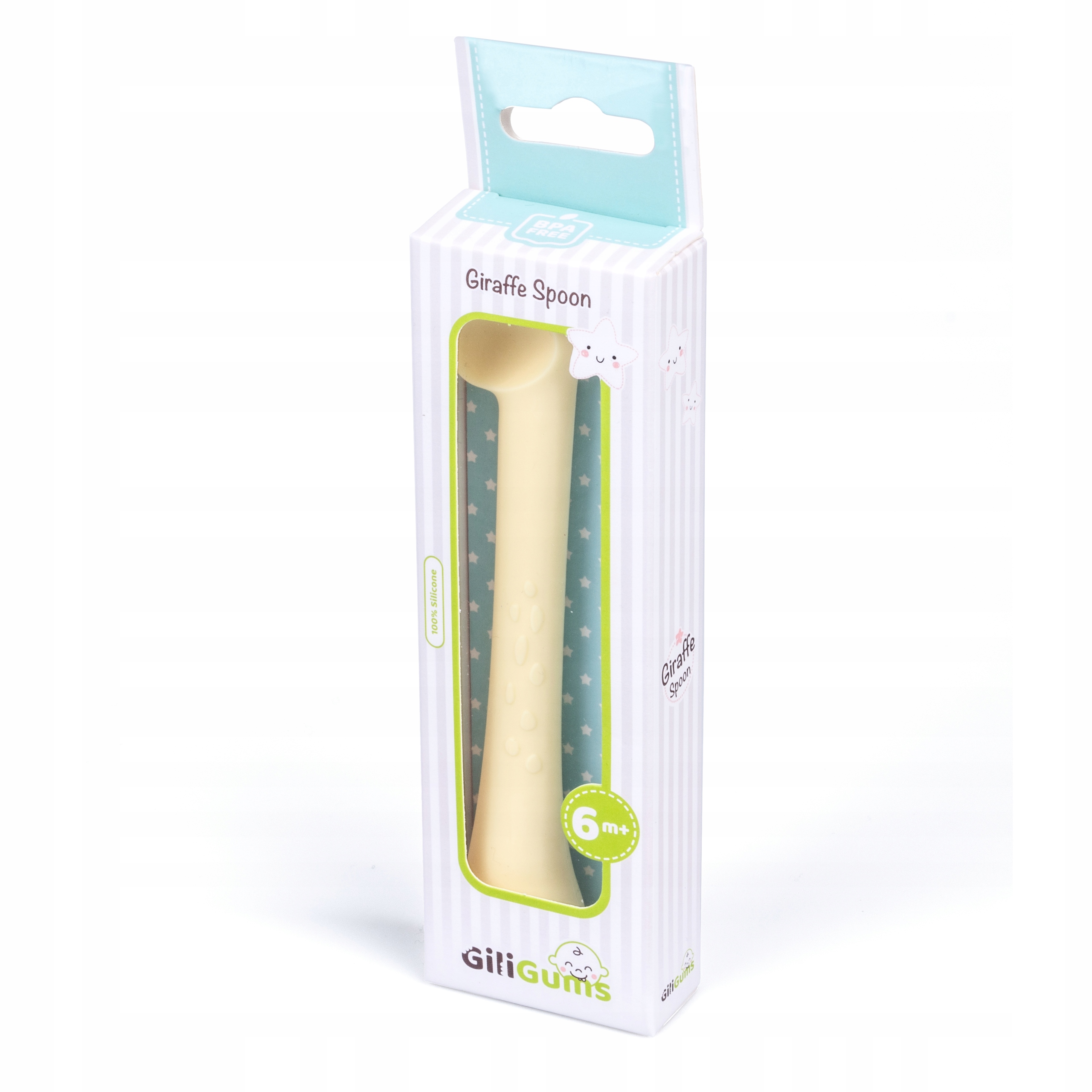 Wykonana z bezpiecznego silikonu Żyrafa posiada na swej długiej szyi wypustki, które masują dziąsła ząbkującego dziecka i zapobiegają wyślizgiwaniu się łyżeczki z małej rączki.