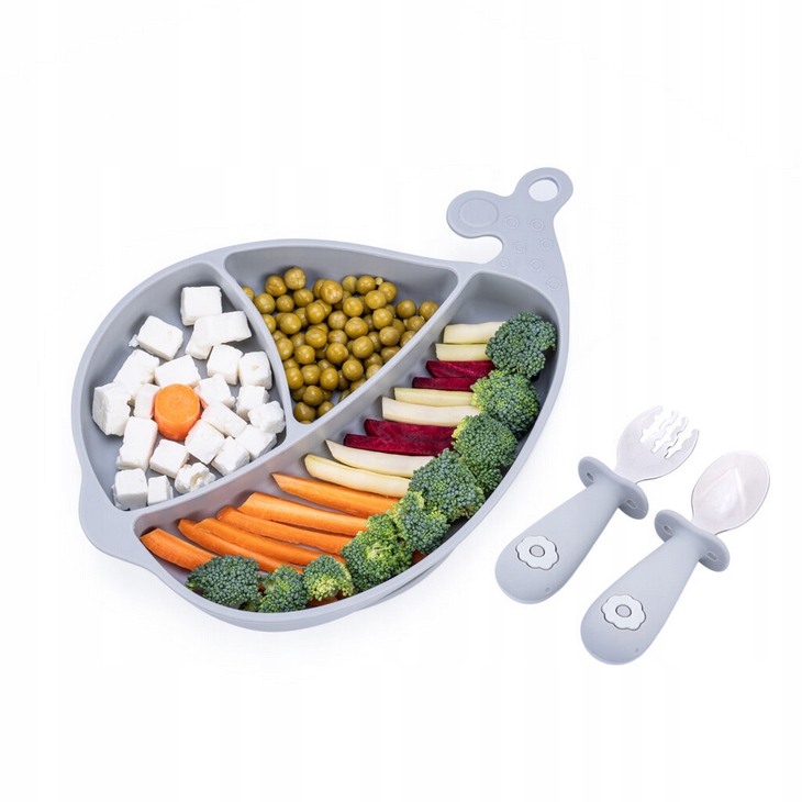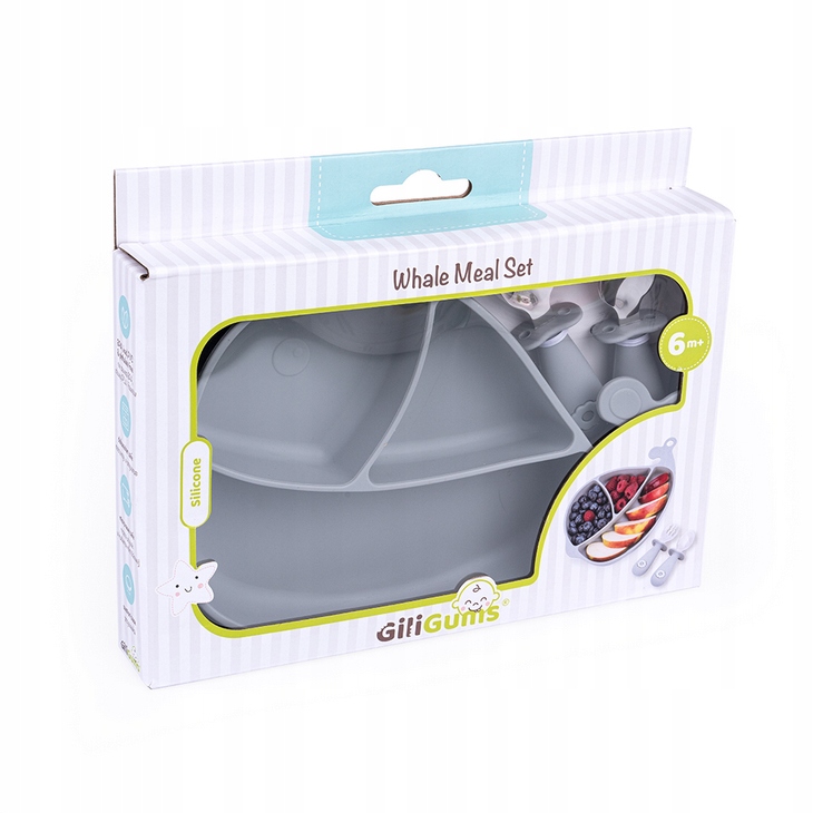 W jego skład wchodzi silikonowy talerzyk w kształcie wieloryba i komplet sztućców (widelec oraz łyżka), wykonanych ze stali nierdzewnej oraz silikonu. Każda z przegródek talerzyka ma inną pojemność, co pozwala na odpowiednie rozmieszczenie poszczególnych elementów posiłku. W postawie talerzyka znajduje się silikonowa przyssawka, która zapobiega przesuwaniu się talerza, ułatwiając tym samym maluchowi spożywanie posiłku. Sztućce wyposażone są w silikonowe uchwyty, które zapobiegają niekontrolowanemu wyślizgiwaniu się łyżki czy widelca z rączki. Zestaw dostępny jest również w kolorze szarym.