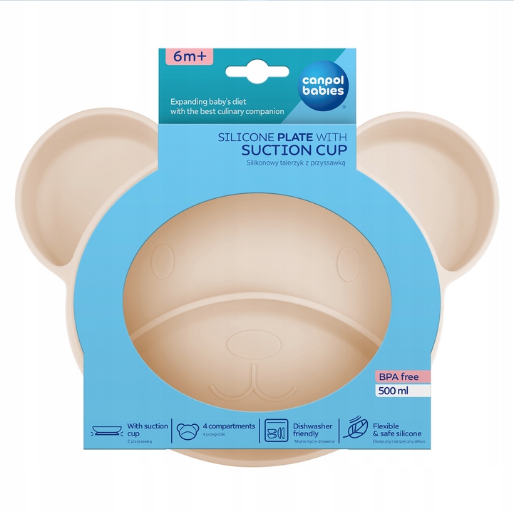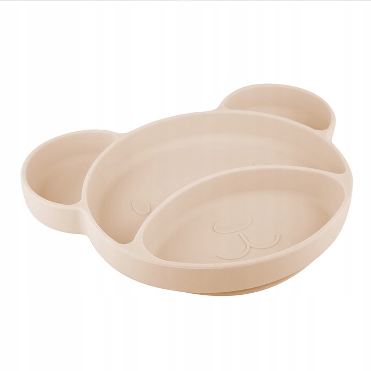 Cztery przegródki ułatwiają porcjowanie i sortowanie różnych smakołyków, co zachęca do próbowania nowych smaków i samodzielnego jedzenia. Talerz ma antypoślizgową przyssawkę, która zapobiega niekontrolowanemu przemieszczaniu się naczynia po powierzchni stołu lub blatu krzesełka do karmienia, uniemożliwia wywrócenie naczynia lub zrzucenie w całości na podłogę. Talerzyk trójdzielny z przyssawką został wykonany w 100% z wysokiej jakości silikonu przeznaczonego do kontaktu z żywnością. Talerz silikonowy jest elastyczny, wytrzymały i nietłukący się, co jest bardzo istotne w przypadku małych dzieci. Można myć w zmywarce i podgrzewać w mikrofalówce.