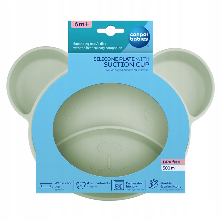 Cztery przegródki ułatwiają porcjowanie i sortowanie różnych smakołyków, co zachęca do próbowania nowych smaków i samodzielnego jedzenia. Talerz ma antypoślizgową przyssawkę, która zapobiega niekontrolowanemu przemieszczaniu się naczynia po powierzchni stołu lub blatu krzesełka do karmienia, uniemożliwia wywrócenie naczynia lub zrzucenie w całości na podłogę. Talerzyk trójdzielny z przyssawką został wykonany w 100% z wysokiej jakości silikonu przeznaczonego do kontaktu z żywnością. Talerz silikonowy jest elastyczny, wytrzymały i nietłukący się, co jest bardzo istotne w przypadku małych dzieci. Można myć w zmywarce i podgrzewać w mikrofalówce.