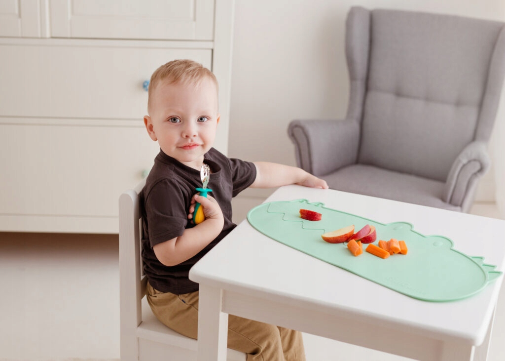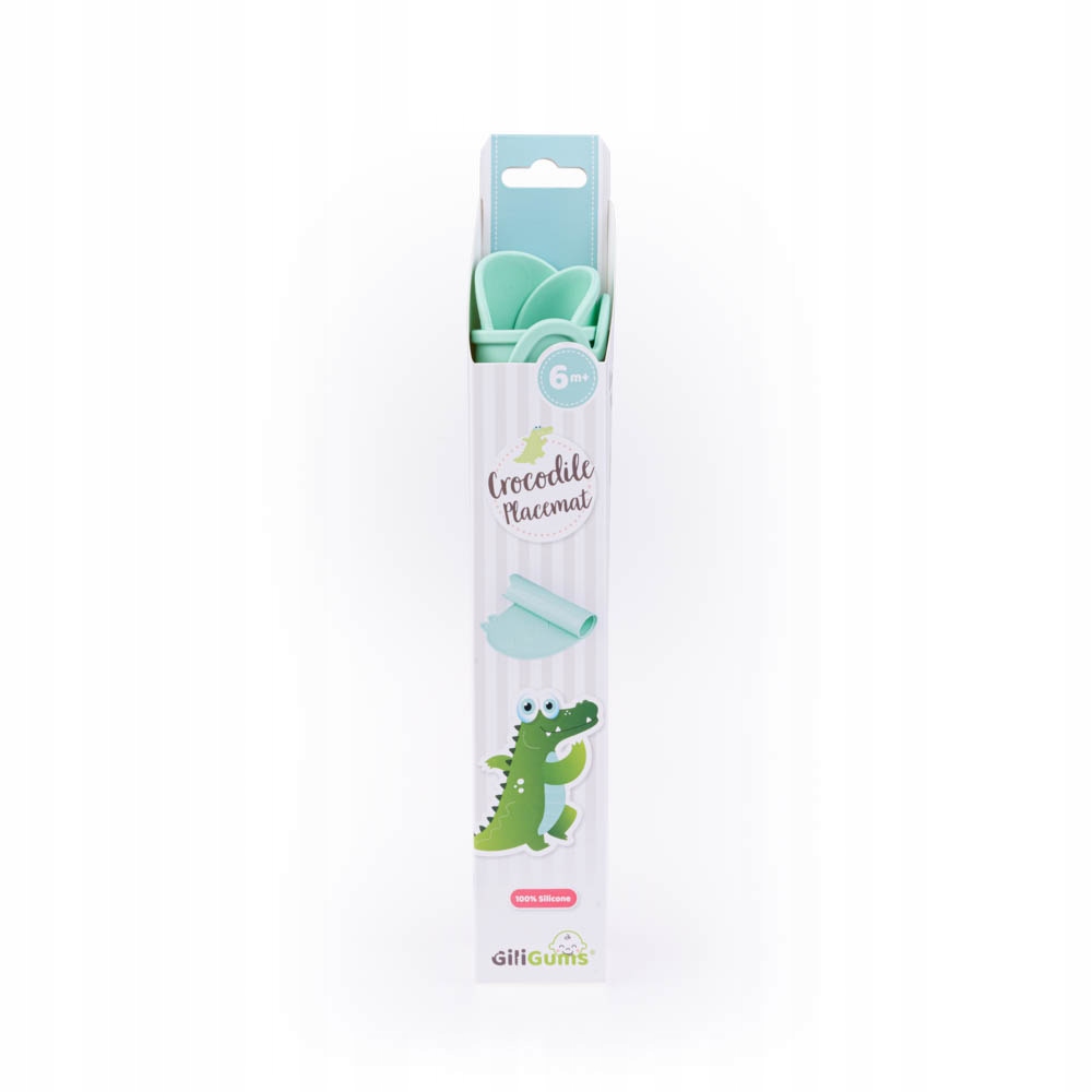 Krokodylek w pięknym, pastelowym kolorze to duża mata, z pomocą której wyczarujesz maluchowi stanowisko do jedzenia w dowolnym miejscu!