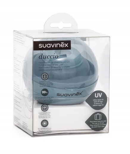Sterylizator do smoczków uspokajaczy, to poręczne urządzenie, które dzięki światłu ultrafioletowemu (UV) eliminuje zarazki znajdujące się na smoczkach. I to w zaledwie 3 minuty! Sterylizator jest kompatybilny z każdym rodzajem smoczka. Zasilanie urządzenia to baterie lub kabel USB. Sterylizator jest mały i lekki zatem idealny do zabrania poza dom czyli na spacer, wyjazd czy wakacje.
