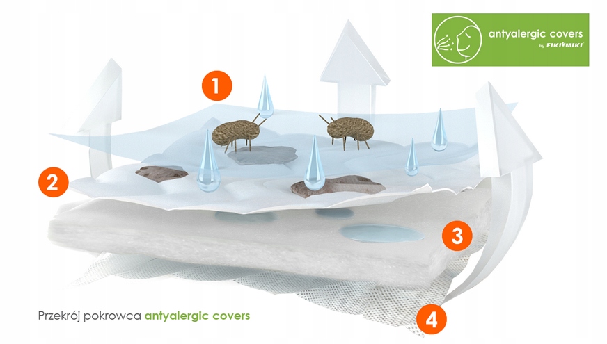 1. Czterowarstwowego pokrowca (konstrukcja 4W) wykonanego z dzianiny 100% poliestrowej wykończonej protektorem SANITIZED®*), puszystej włókniny poliestrowej i płaskiej włókniny polipropylenowej.