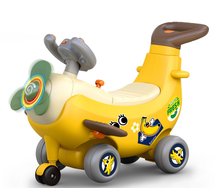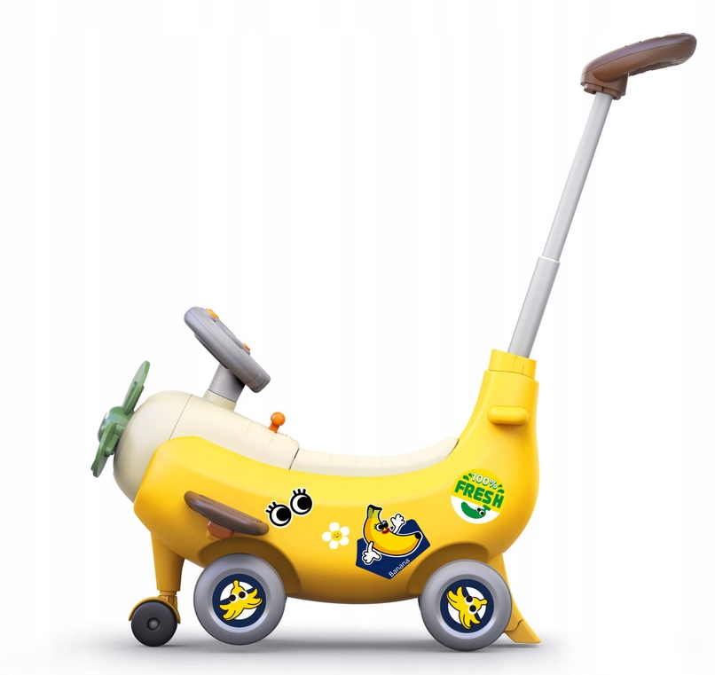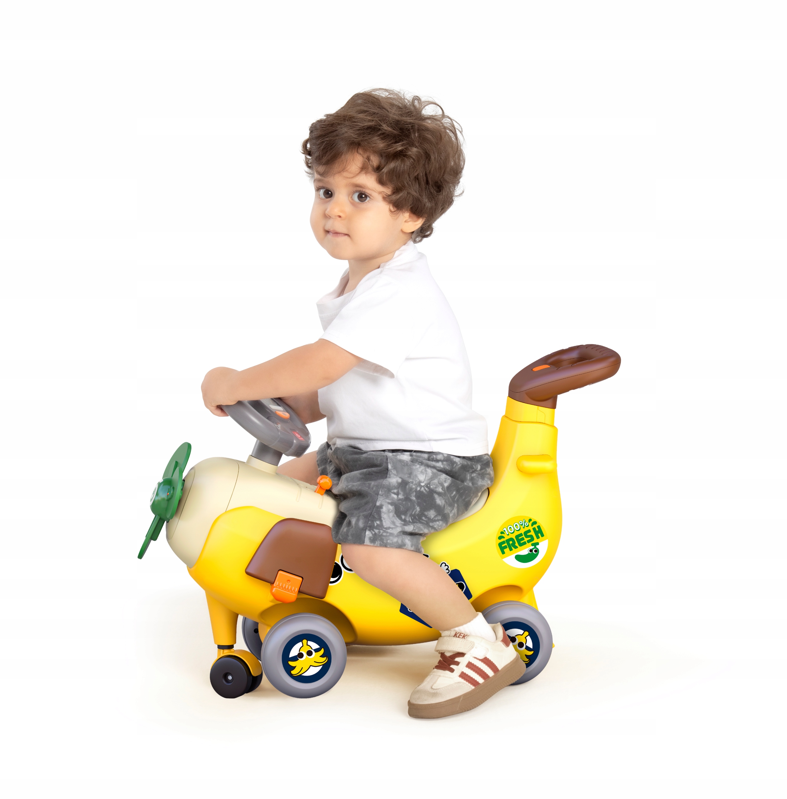 Ten uroczy jeździk wyposażony został w wiele intuicyjnych i praktycznych rozwiązań, które umilą maluchowi zabawę. Znajdziemy tu podnoszone siedzisko, składane podnóżki, wyciąganą rączkę do prowadzenia, a także rozkładaną podpórkę, zapobiegającą niekontrolowanemu przewracaniu się jeździka do tyłu. Z jeździka dziecko może korzystać na cztery różne sposoby, siedząc i odpychając się nóżkami (złożone podnóżki), „jadąc” z nóżkami na podnóżkach (jeździk prowadzony przez osobę dorosłą), spacerując z jeździkiem, prowadząc go rączką przed sobą, a także w formie statycznej, siedząc w jeździku i bawiąc się elektroniczną kierownicą. Bananolot kryje w sobie wiele dźwięków, melodii, posiada nawet klakson! Dodatkowo, wyposażony został on w ruchome elementy, które upodabniają go do prawdziwego pojazdu, a są nimi śmigło (obracanie śmigła uruchamia przycisk oraz drążek), drążek sterowania i, wcześniej wspomniana, kierownica.