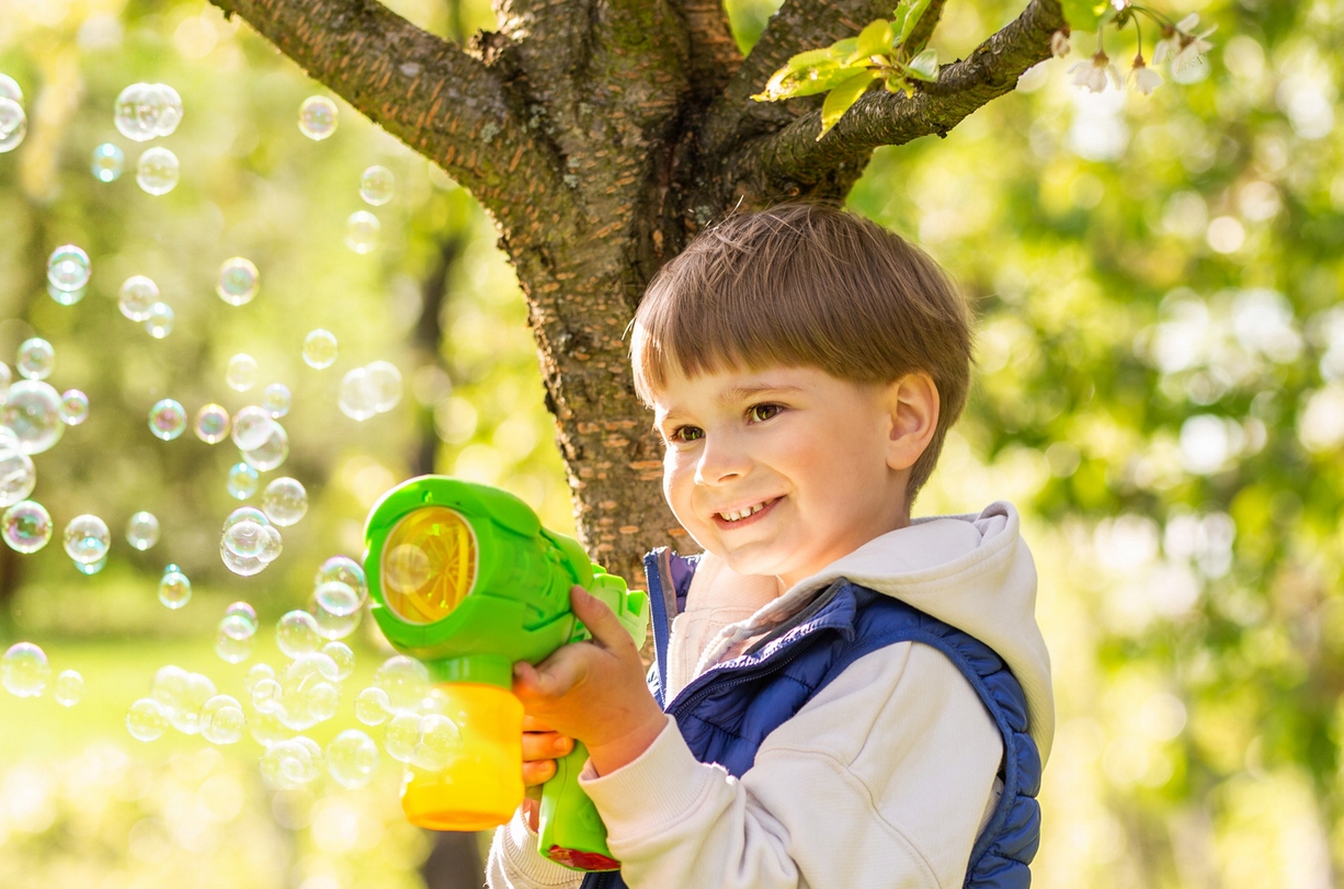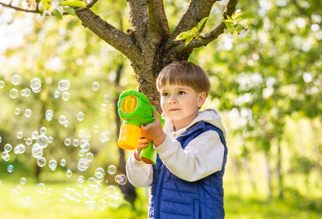 – wkręć butelkę z płynem do zabawki, a następnie naciśnij spust wyrzutni, a wystrzeli z niej strumień baniek;