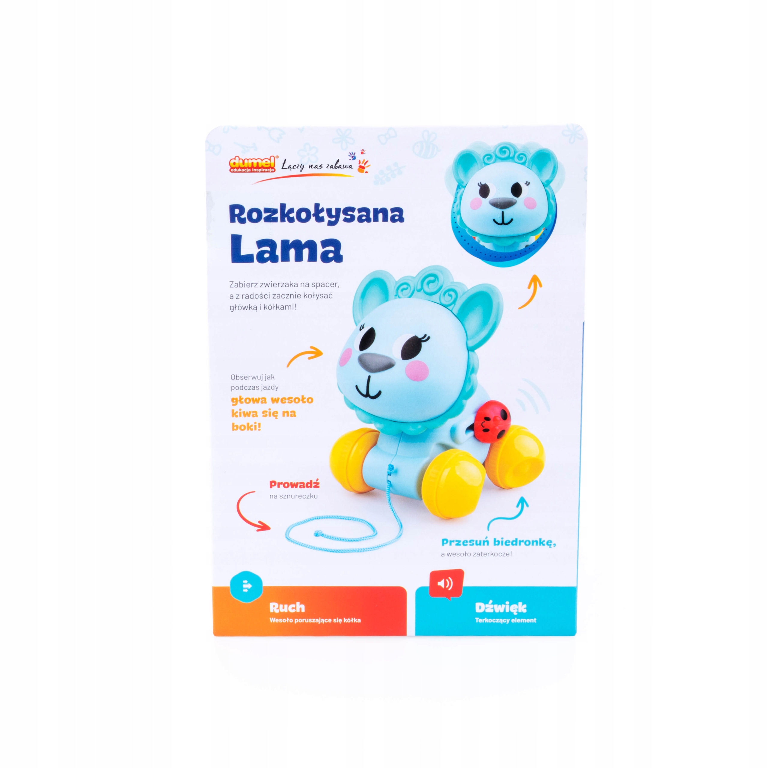 Kiedy maluch prowadzi rączką zwierzaka, ten jedzie, zabawnie kołysząc przy tym głową na boki. Lama wyposażona jest w cztery kółeczka o nieregularnym kształcie, co zapewnia ciekawy efekt wizualny. Dodatkowo, można je rozpędzić, aby postawiony na podłodze zwierzak pojechał samodzielnie do przodu. Na boku lamy siedzi biedroneczka, która przy przesuwaniu wydaje terkoczący odgłos.