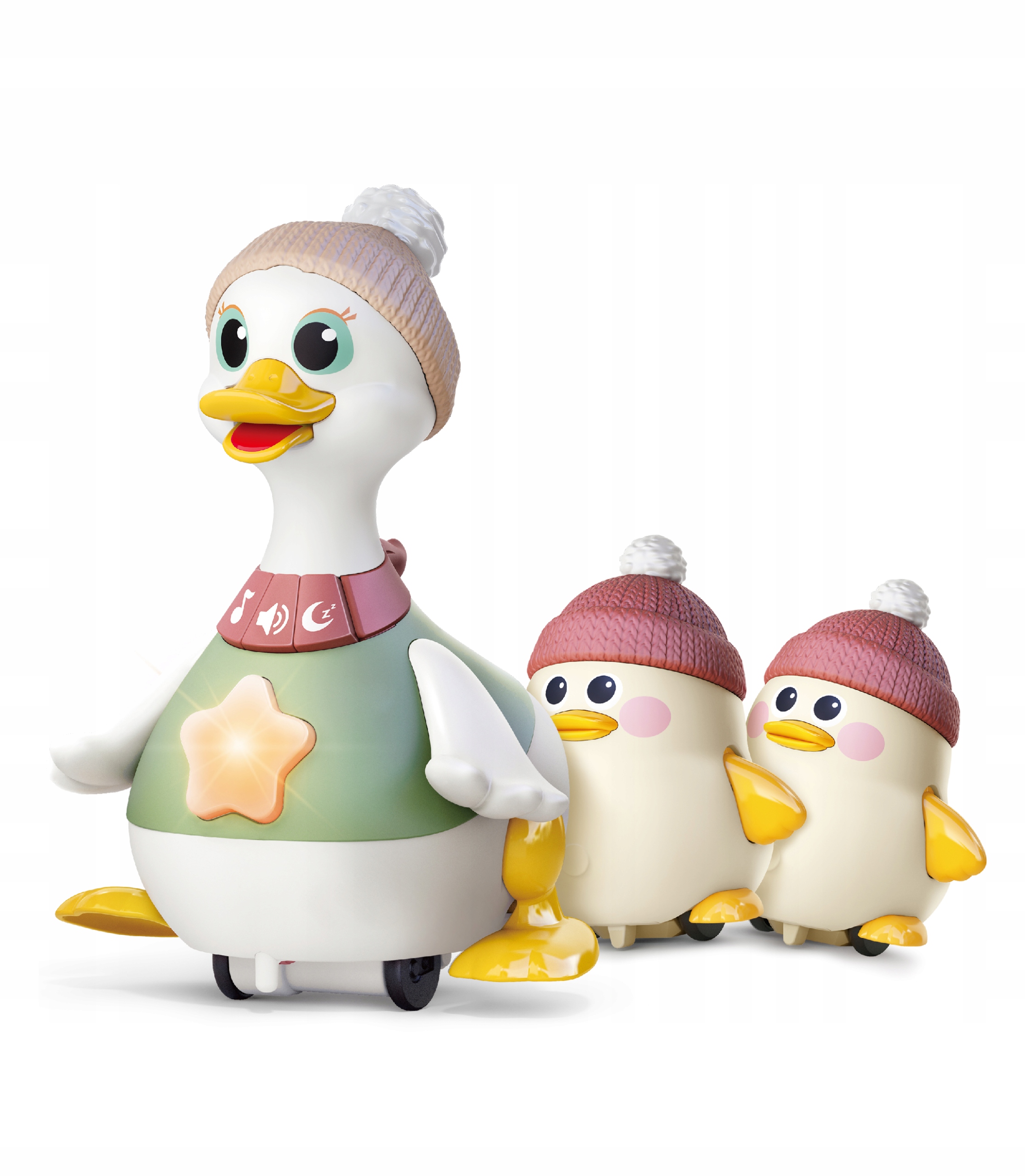 To kacza rodzinka, mamusia i jej dwa urocze maluchy! Ta zgrana ekipa wesoło podąża przed siebie, przy dźwiękach miłych dla ucha piosenek. Kaczuszki łączą się ze sobą, jeżdżąc jedna za drugą „gęsiego”, ale potrafią poruszać się także w pojedynkę. Dodatkowo, małe kaczuszki można połączyć ze sobą skrzydełkami, aby tańczyły, kręcąc się naokoło lub grzecznie spacerowały w parze. Kacza mama wyposażona została w świecącą gwiazdkę na brzuszku oraz dwa przyciski, aktywujące melodie oraz trzeci, środkowy, służący regulacji głośności. Duża kaczka działa w trybie dynamicznym, opisanym wyżej, oraz w trybie statycznym, który przekształca ją w „lampkę” nocną, odtwarzającą kołysanki.