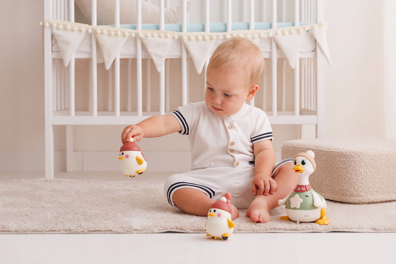 – kaczka jeździ do przodu przy dźwiękach melodii, a dzięki wbudowanym magnesom, można przyczepić do niej jej dzieci – małe kaczuszki, aby cała rodzinka podążała za sobą gęsiego;