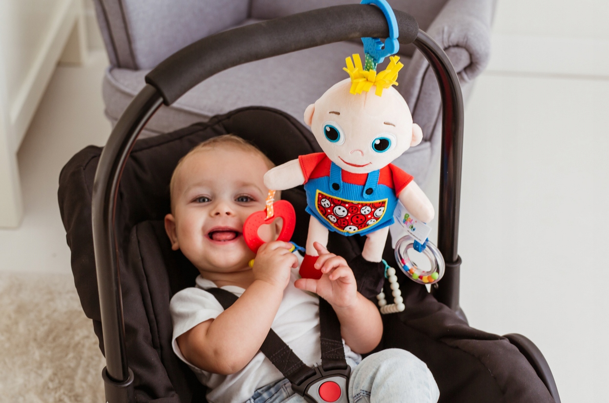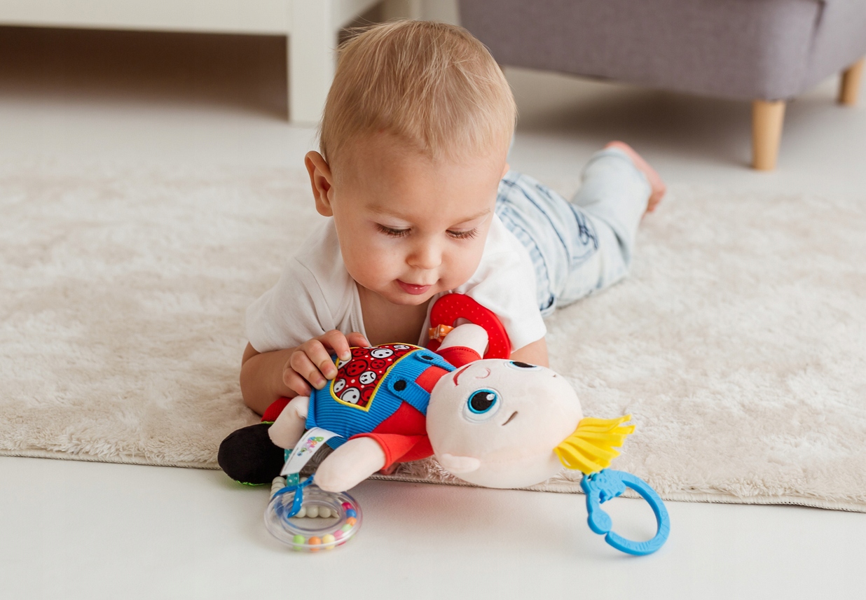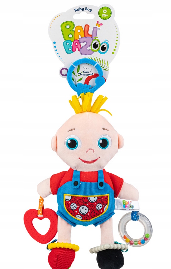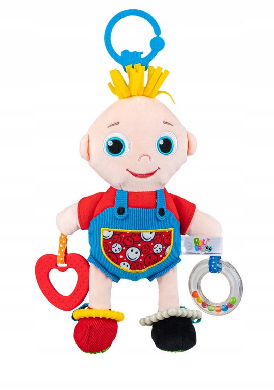 Wesoła, materiałowa lalka w kształcie małego chłopczyka to zawieszka, która towarzyszyć może dziecku w dowolnym miejscu, zarówno na spacerze, jak i w domowym zaciszu. Zabawka kryje w sobie wiele niespodzianek. Zdobią ją gryzaki oraz grzechotka, a sam materiał, z którego została wykonana, odznacza się zróżnicowanymi fakturami, które stymulować będą zmysł dotyku dziecka. Praktyczna zawieszka pozwoli przyczepić lalkę w dowolnym miejscu.