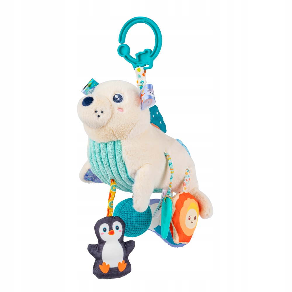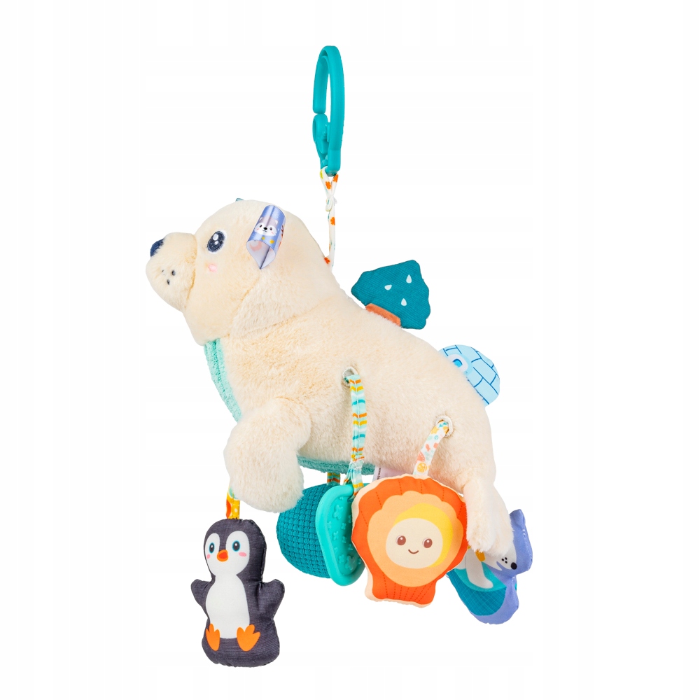 Jest tu bezpieczne lusterko do samopoznania bobasa, linki do przeciągania, materiałowy pingwinek i miś polarny, a także kolorowe metki z obrazkami. Milutkie futerko zachęca do przytulania zwierzaka, a zróżnicowane faktury zastosowanych w nim materiałów, zachęcą bobasa do rozwijania zdolności poznawczych. Zabawka wyposażona jest w praktyczną zawieszką, więc można ją przyczepić w dowolnym miejscu, aby towarzyszyła maluchowi w każdej sytuacji.
