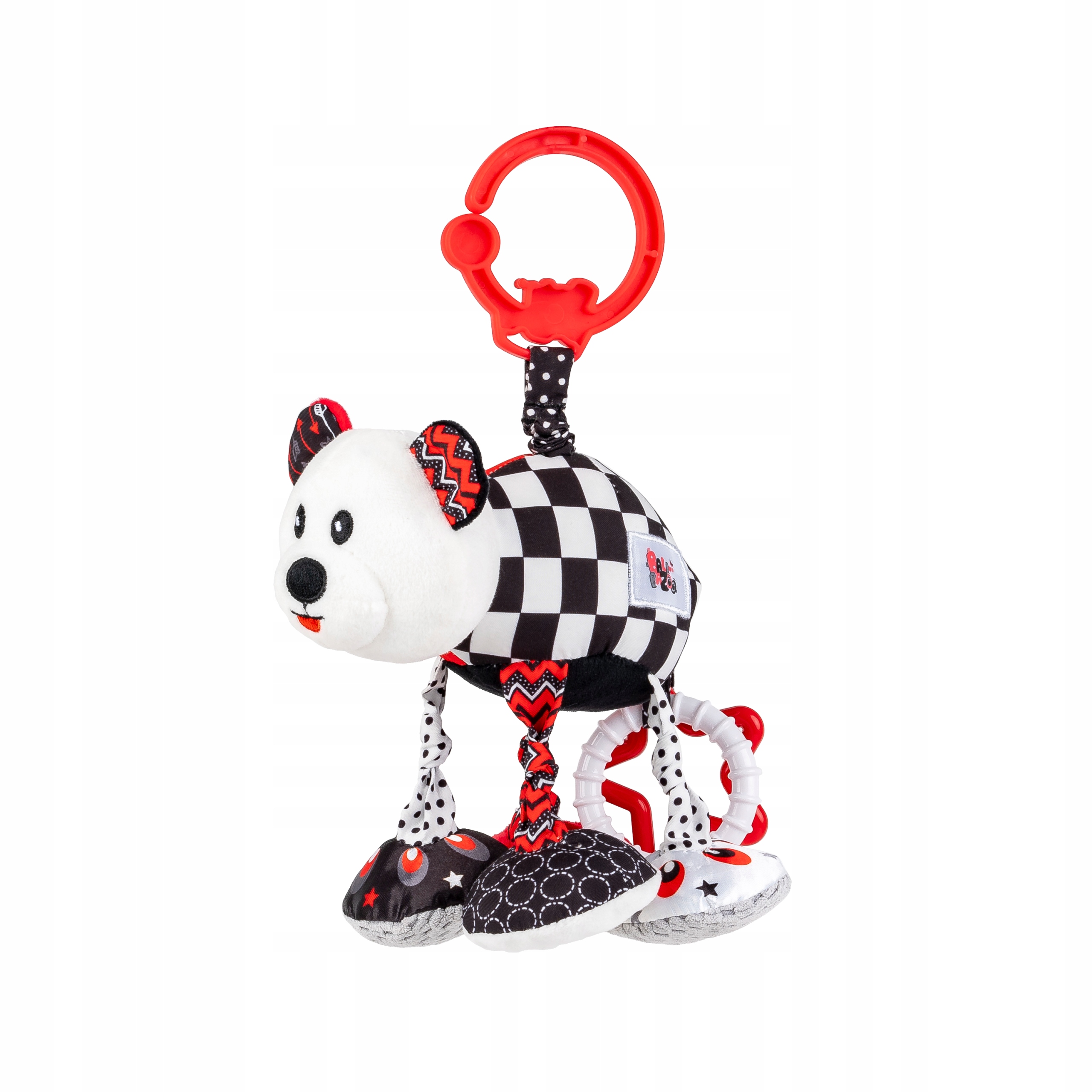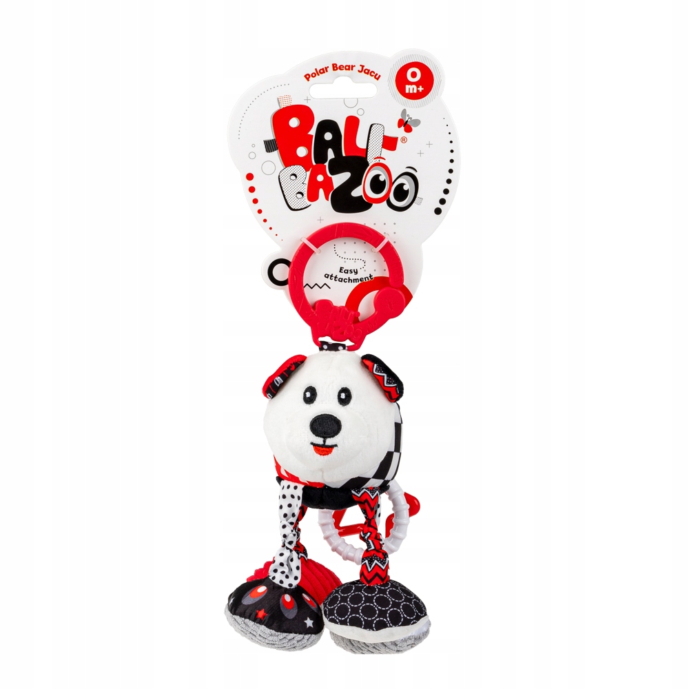 Misiek w kontrastowych kolorach posiada doczepione zawieszki w kształcie gwiazdki i kółeczka. Zabawka została uszyta z materiałów różniących się kolorem, wzorem i fakturą, co pozwoli najmłodszym rozwijać zdolności poznawcze, stymulując przy tym zmysł wzroku i dotyku. Pluszak wyposażony został w funkcję wibracji. Wystarczy pociągnąć miśka w dół, a podciągnie się z powrotem na materiałowej harmonijce, zabawnie przy tym wibrując. Zabawka posiada praktyczną zawieszkę, która umożliwia jej zaczepienie w dowolnym miejscu.