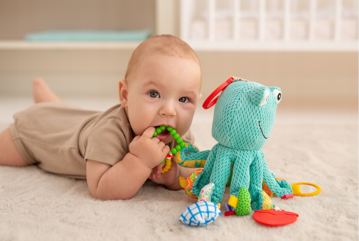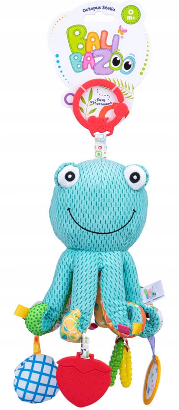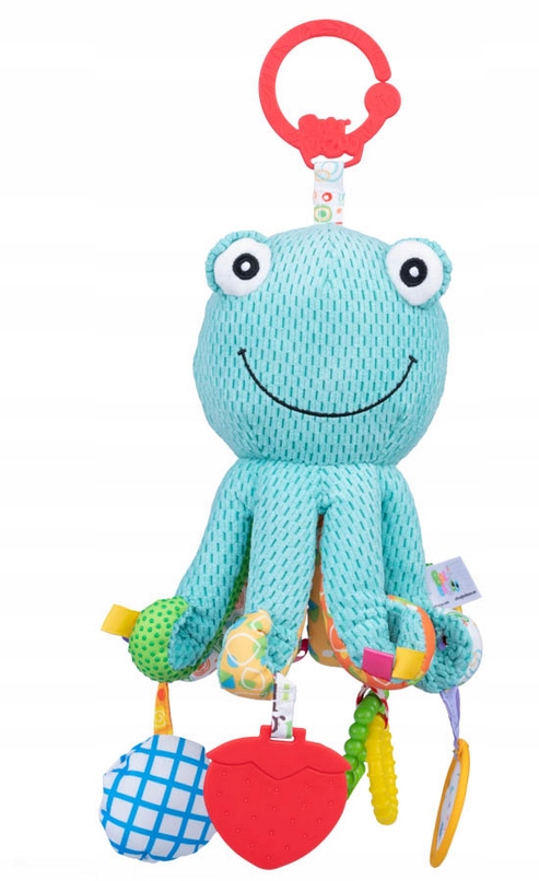 Co najmniej tyle ile posiada ona kolorowych macek! Pluszak wykonany jest ze zróżnicowanych materiałów, odnóża zdobią kolorowe, materiałowe metki, różniące się fakturą, a do nich przymocowane są gryzaki, piszczałka oraz bezpieczne lusterko do samopoznania dziecka. Przy potrząsaniu, Ośmiornica wesoło grzechocze, rozweselając maluchy! Praktyczna zawieszka, znajdująca się przy jej głowie pozwala na przyczepienie zabawki w dowolnym miejscu.
