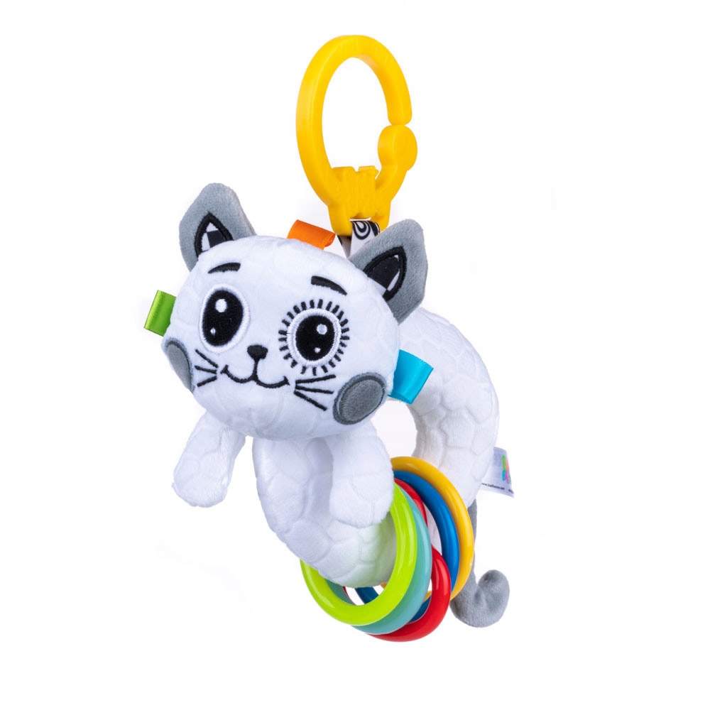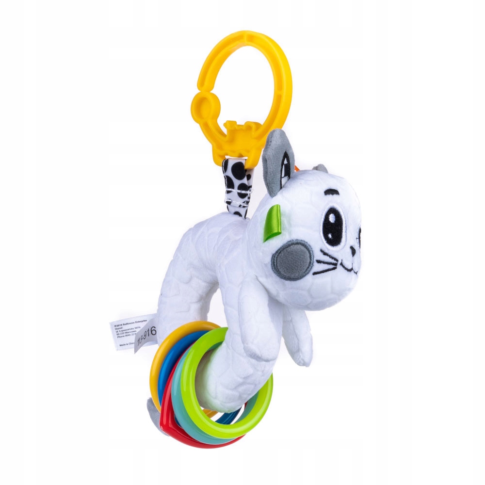 Jego główkę zdobią metki o zróżnicowanej fakturze, a brzuszek – kolorowe kółeczka, które wesoło grzechoczą przy potrząsaniu. Praktyczna klamra pozwoli przymocować zabawkę w dowolnym miejscu.