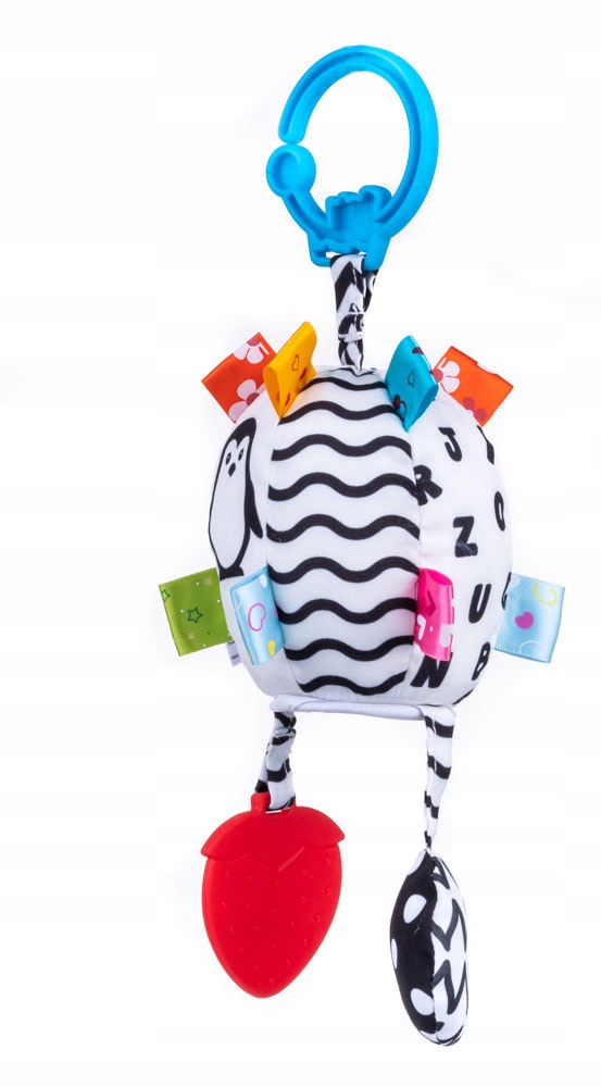 Pomaga im w tym Zawieszka Piłka Sensory z nadrukowanymi podobiznami zwierzątek oraz z pojedynczymi literkami. Na piłeczce znajdują się też kontrastowe paseczki i kolorowe metki o zróżnicowanej fakturze, a pod spodem bezpieczne lusterko do samopoznania malucha! Wszystko to po to, aby jeszcze bardziej stymulować rozwój najmłodszych! Praktyczna klamra pozwala przyczepić zawieszkę w dowolnym miejscu. Zabawka przeznaczona dla dzieci od dnia narodzin.