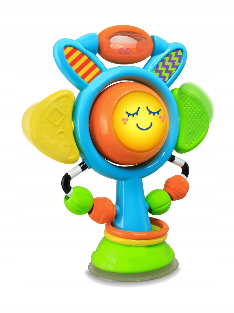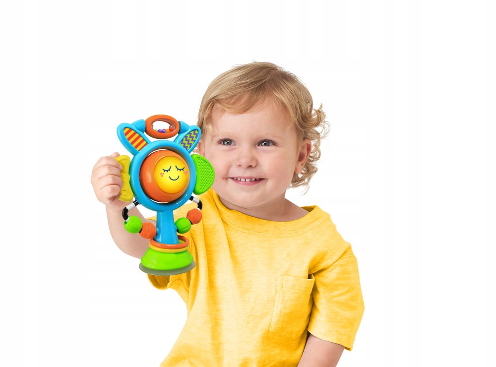 Wesołe słoneczko, które pomimo niewielkich rozmiarów łączy w sobie mnóstwo niespodzianek dla najmłodszych. Znajdziemy tu obrotowe elementy o zróżnicowanej fakturze, grzechotkę z kolorowymi kuleczkami, ruchome koraliki, a także praktyczną przyssawkę, za pomocą której bez kłopotu przyczepisz słoneczko do dowolnej płaskiej powierzchni. Naciśnij na buzię słoneczka, a zaświeci się ona na różne kolory.
