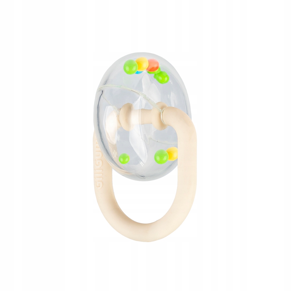 W jej przezroczystym pierścieniu znajdują się kolorowe koraliki, które przy potrząsaniu zabawką wydają zabawny dźwięk. Grzechotka posiada miękki, silikonowy uchwyt, dostosowany do małych rączek, co umili maluchowi korzystanie z zabawki.