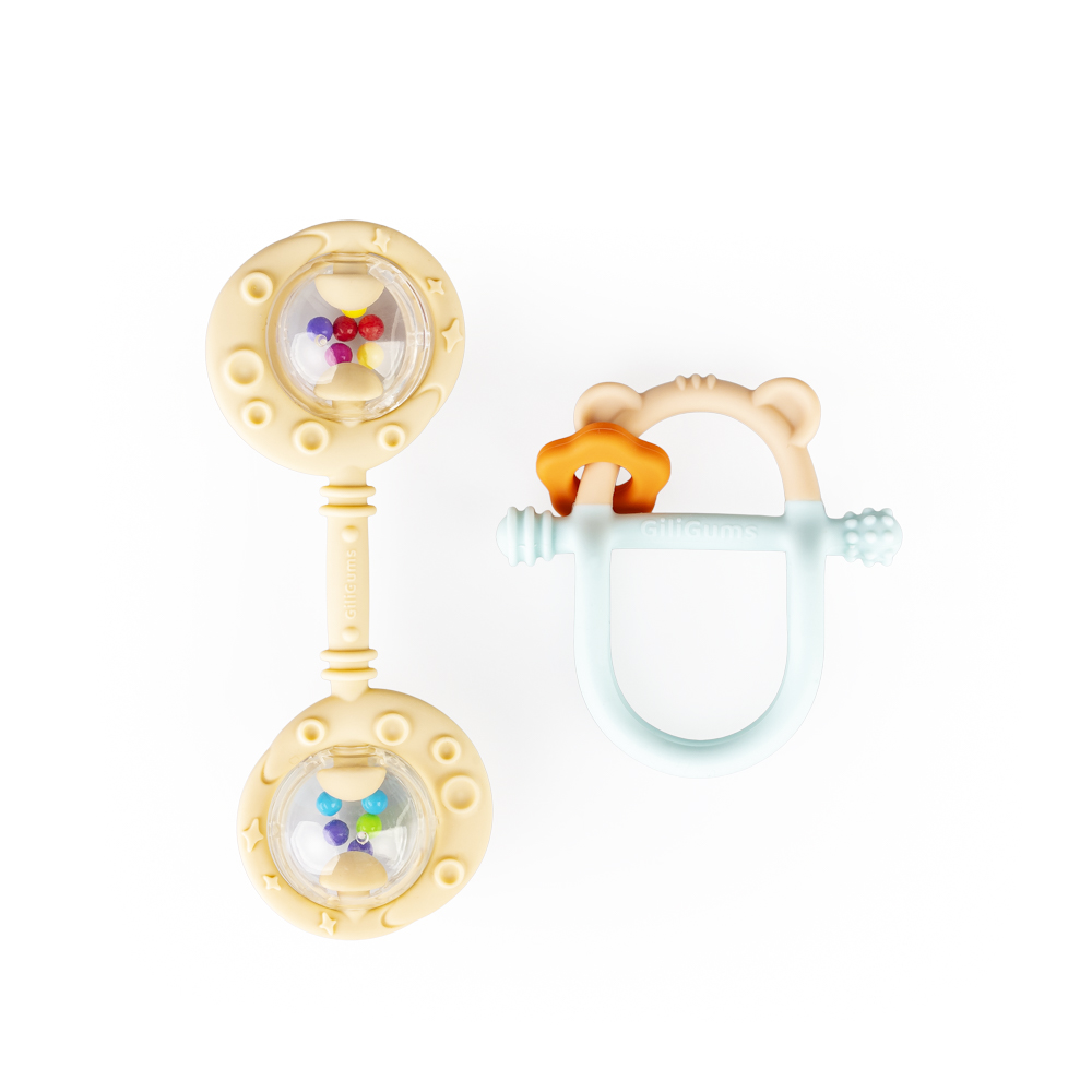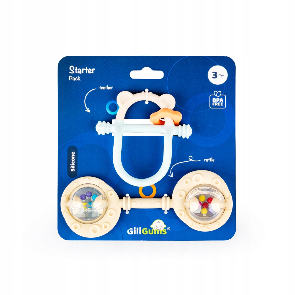 W zestawie znajdziemy gryzak Miś oraz Podwójną Grzechotkę w kolorze beżowym. Obie zabawki posiadają wypustki, które podczas gryzienia będą delikatnie masować dziąsła ząbkującego bobasa. Kształt gryzaczka oraz grzechotki dopasowany jest do małych rączek, co umili maluchowi korzystanie z nich. Ten praktyczny zestaw świetnie sprawdzi się w charakterze prezentu.