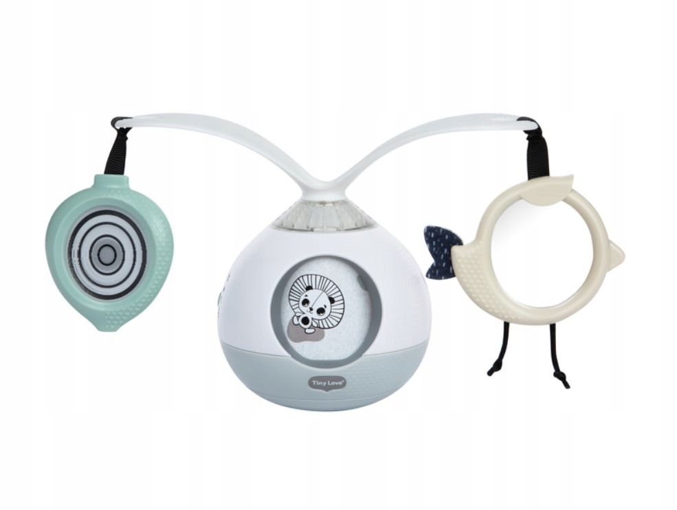 Zabawka posiada balansujący ruch i obracające się o 360° ramiona, na których wiszą przyjazne postacie zwierzątek, z lusterkiem i grafiką spirali, aby nieustannie inspirować dziecko do podnoszenia główki.